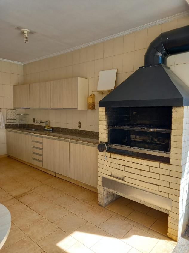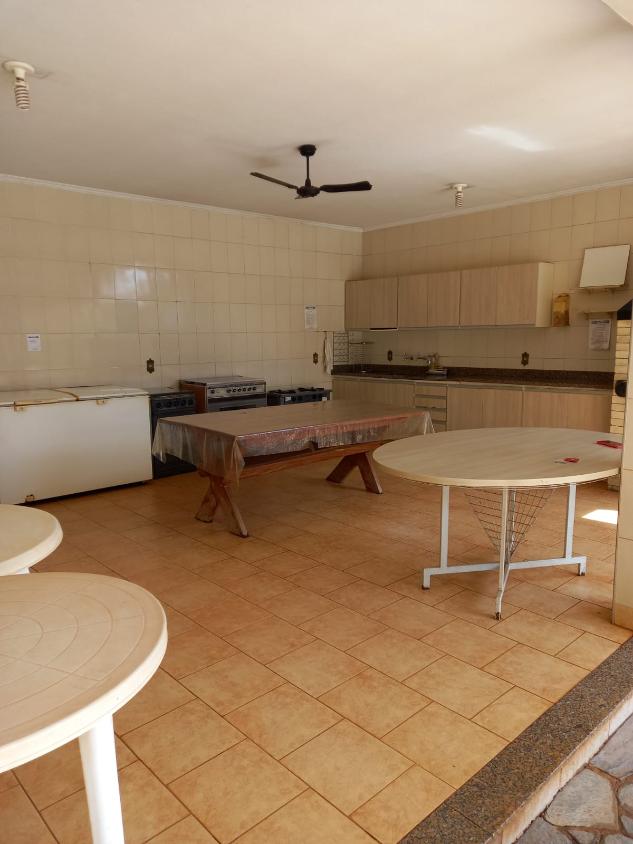 Área de churrasco com frizer, geladeira, fogão, banheiros e vestiários.